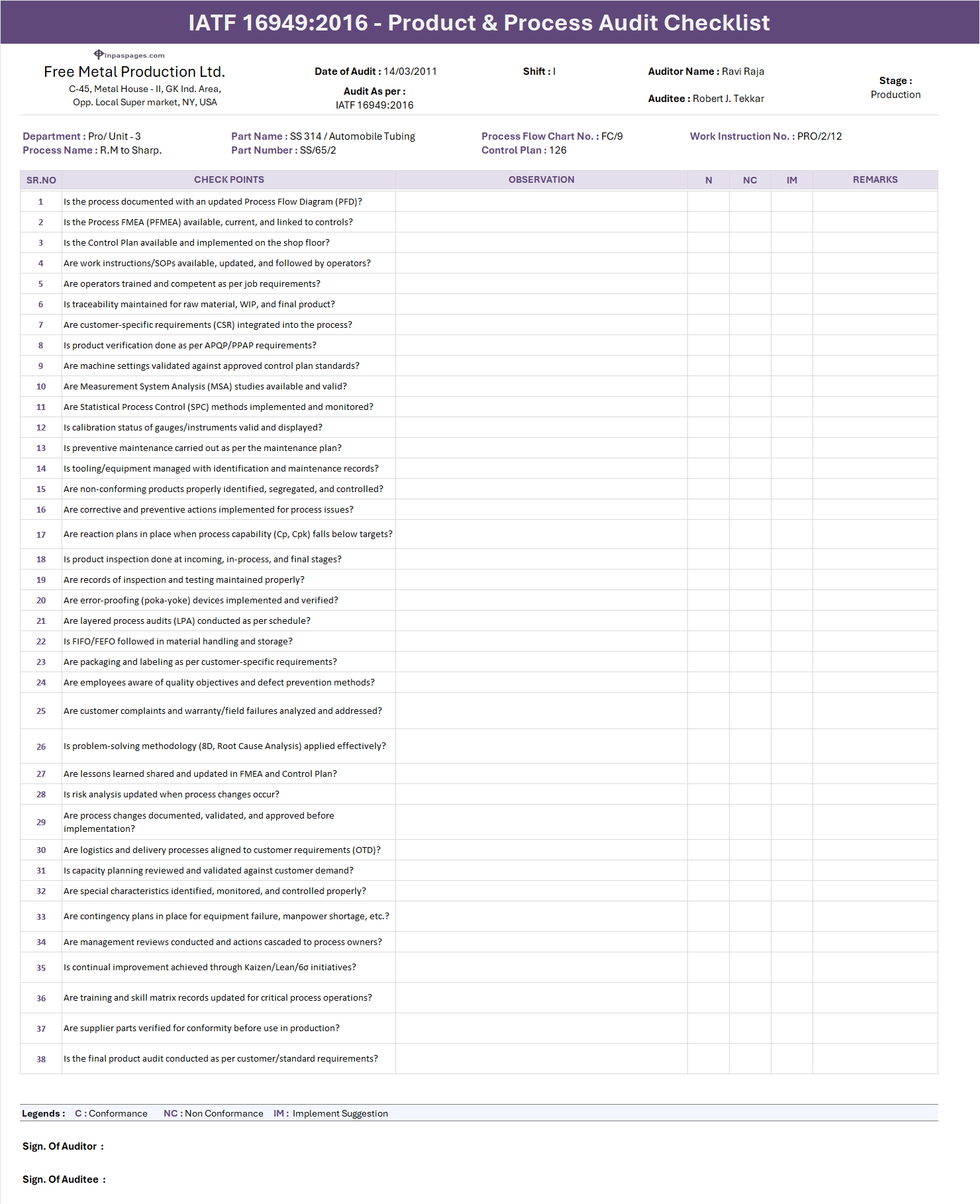 Free IATF 16949 Product Process Audit Checklist Format in PDF, Excel, JPG format - Download IATF 16949 Product Process Audit Checklist Format PDF format