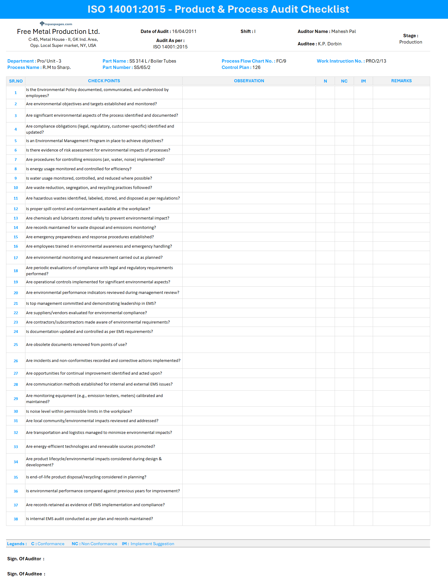 Free ISO 14001 Product Process Audit Checklist Format in PDF, Excel, JPG format - Download ISO 14001 Product Process Audit Checklist Format PDF format