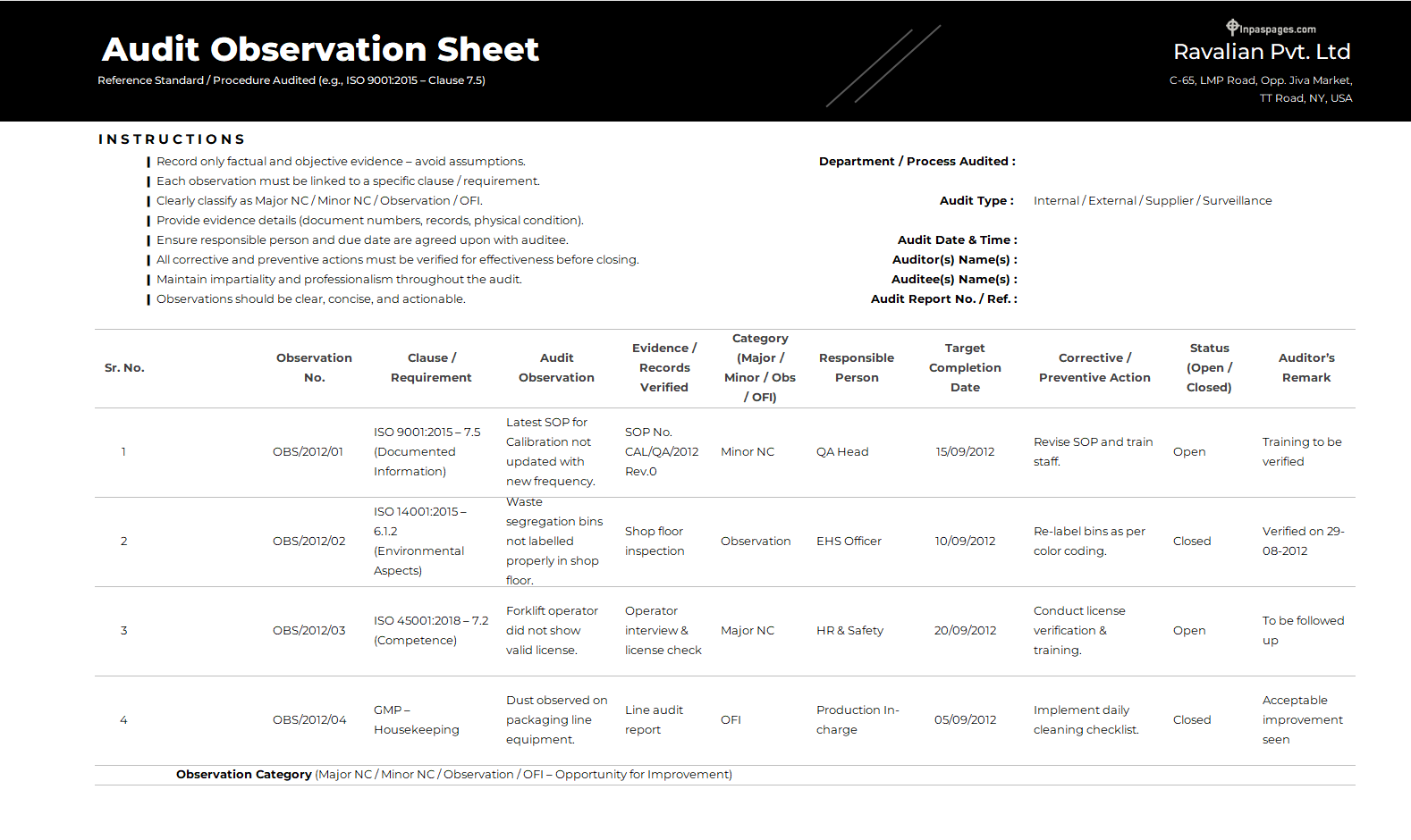 Audit observation sheet Format Image 01 | Examples | Formats | Download for free.