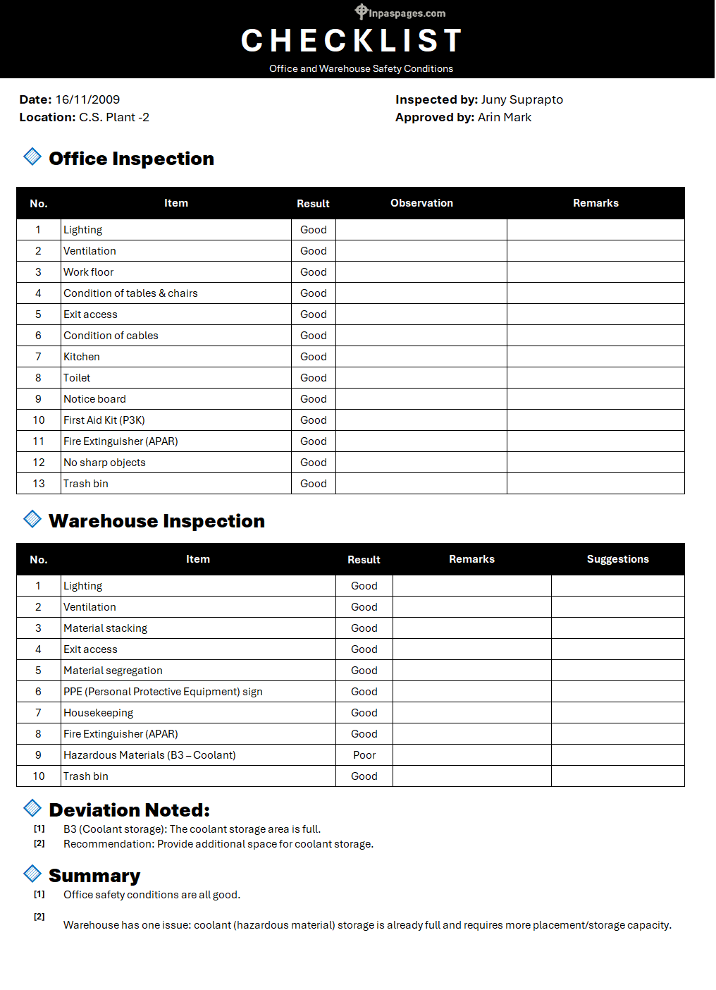 Checklist office warehouse Format | Example | Samples | Excel File | Word Document