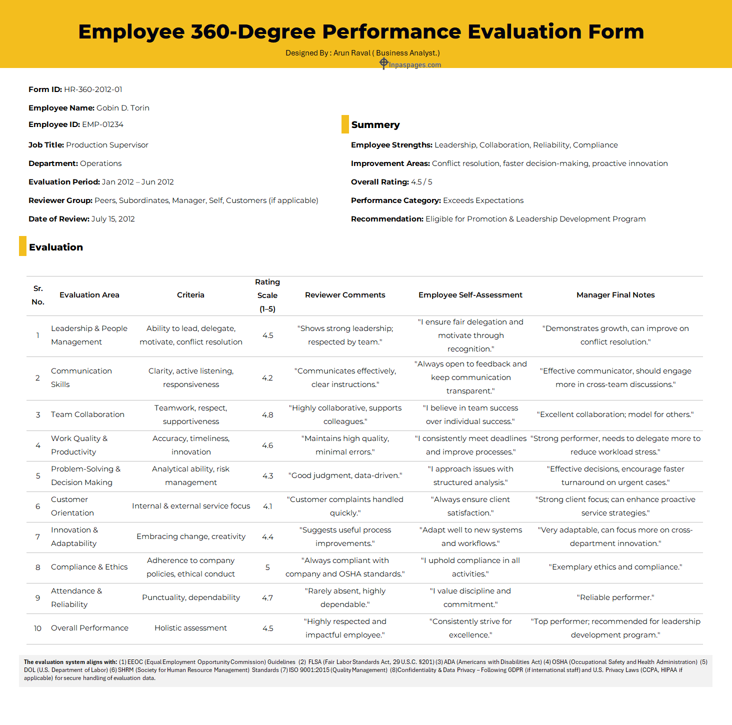 Employee 360 Degree Performance Evaluation Form Format | Example | Samples | Excel File | Word Document