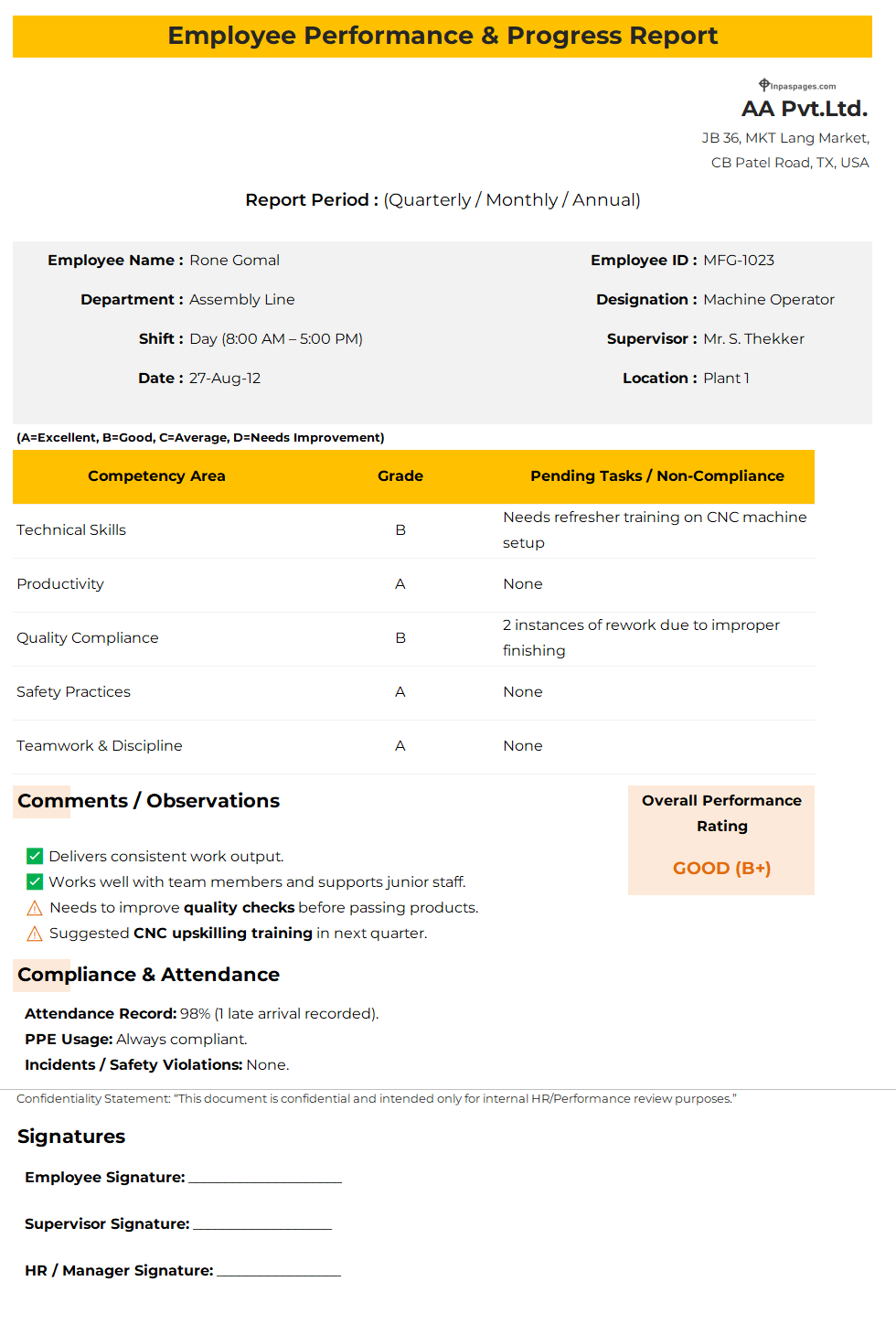 Employee Performance Progress Report Format | Example | Samples | Excel File | Word Document