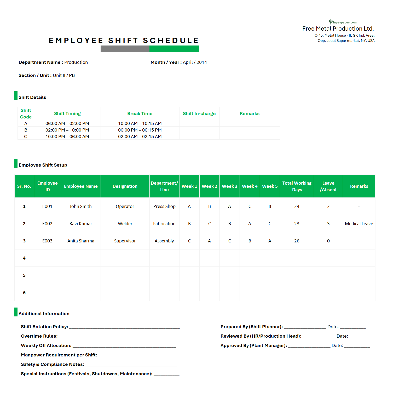 Employee Shift Schedule Format | Example | Samples | Excel File | Word Document