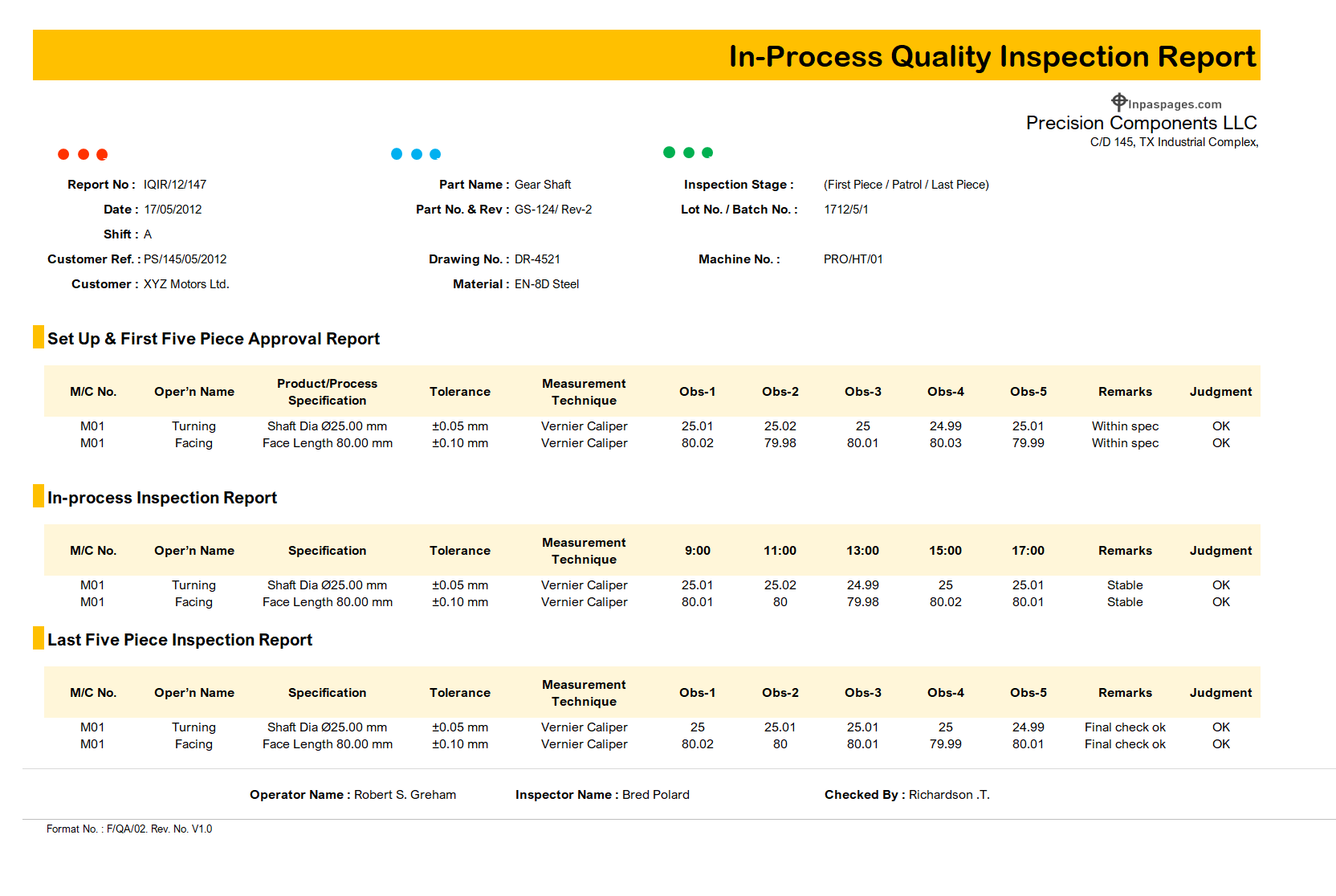 In process Inspection Report Format | Example | Samples | Excel File | Word Document