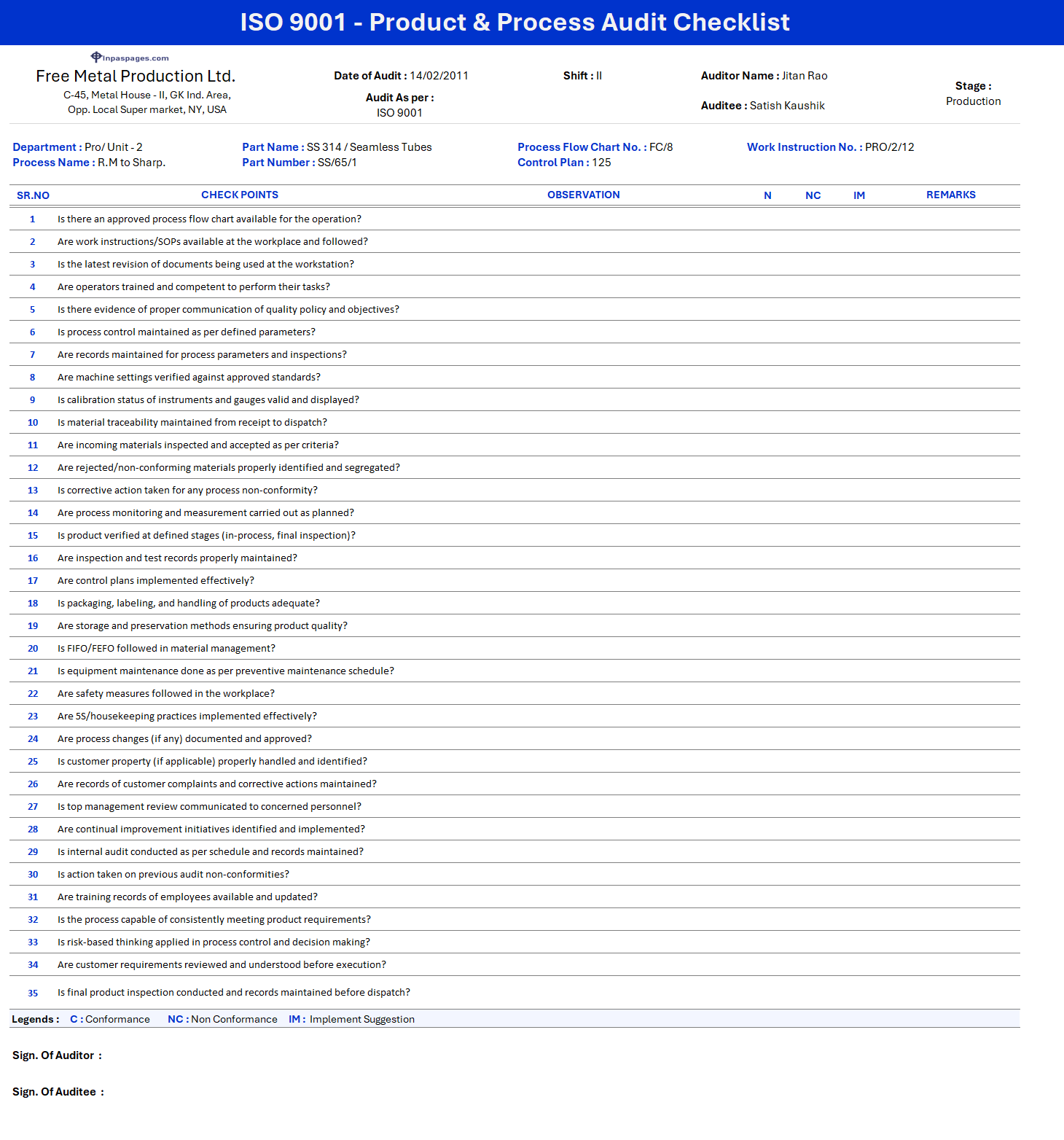 Free ISO 9001 Product & Process Audit Checklist Format in PDF, Excel, JPG format - Download ISO 9001 Product & Process Audit Checklist Format PDF format