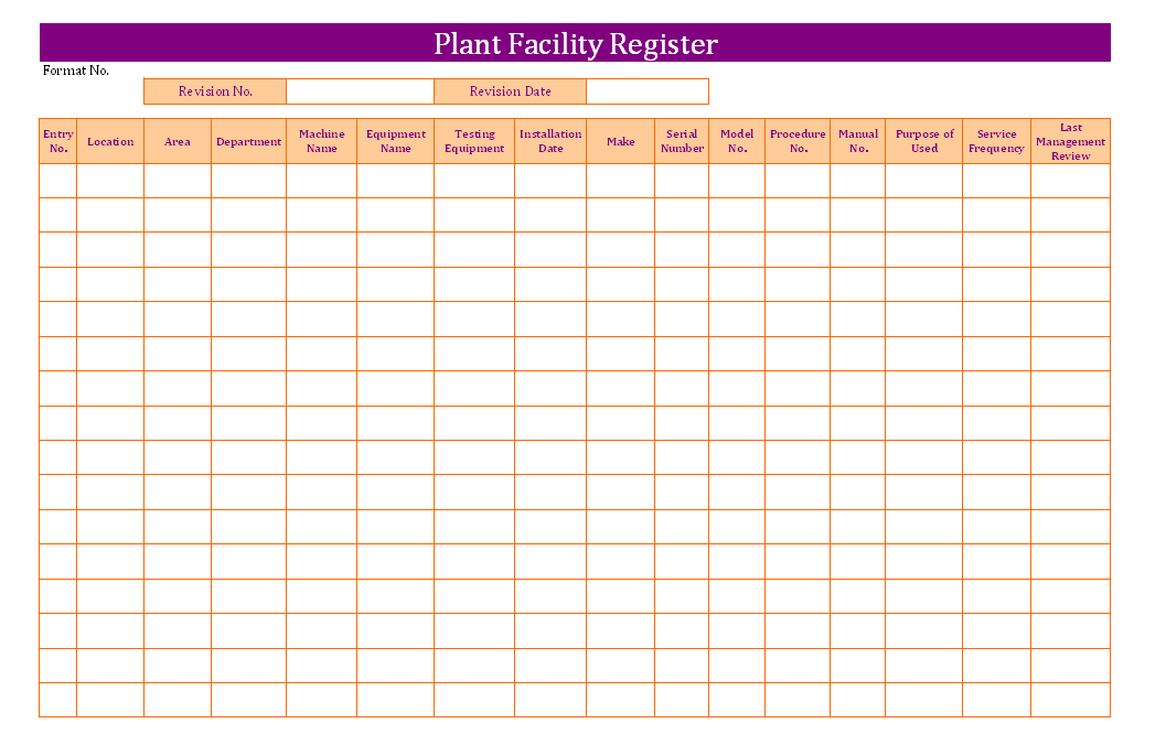 Plant Facility Register format Format | Example | Samples | Excel File | Word Document Plant Facility Register format | Report | Sample | Word document format | Excel Format | PDF format | JPG Format | Free Download Free Download Plant Facility Register format format - Excel Sheet Document File Format Free Plant Facility Register format format in PDF, Excel, JPG format - Download Plant Facility Register format PDF format Plant Facility Register format format Image 01 | Examples | Formats | Download for free